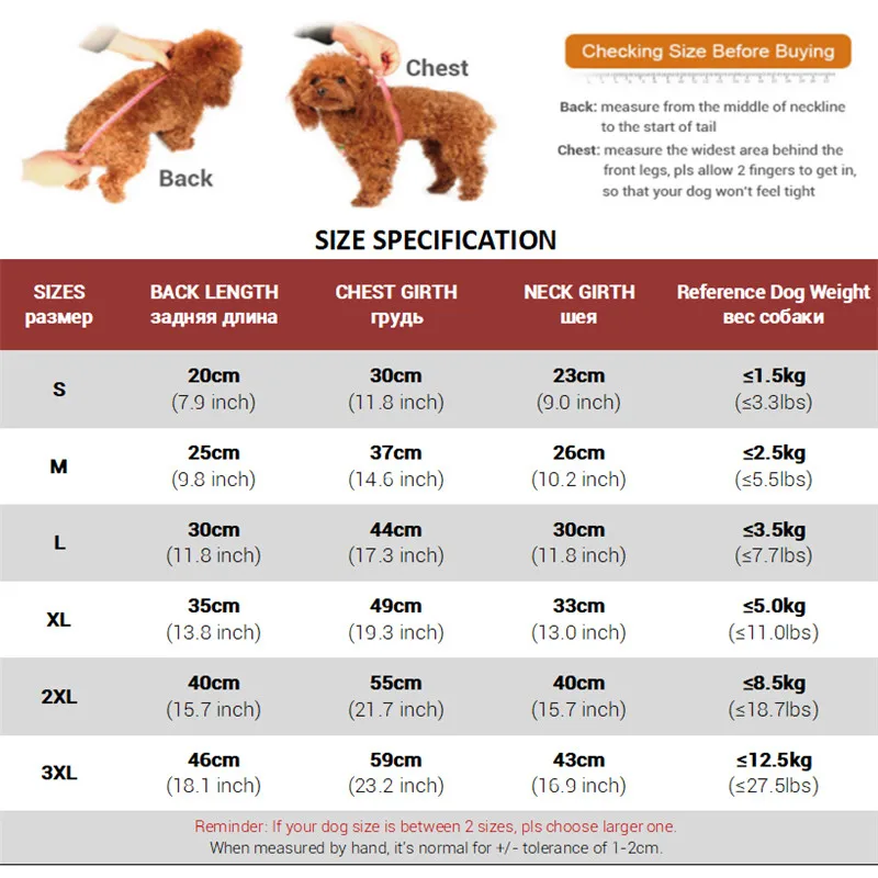 Veuillez mesurer la longueur du dos et le tour de poitrine de votre chien avant d'acheter !